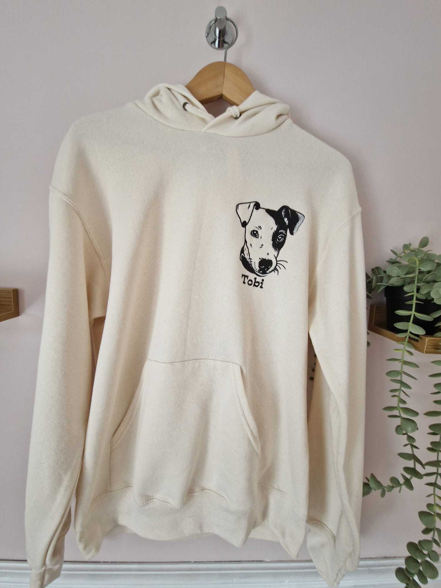 Custom embroidered pet portrait hoodies in a variety of colours and sizes.